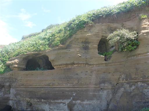 岩壁に開く穴。解説板によると、これは人が掘った穴らしい。