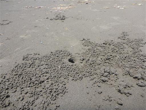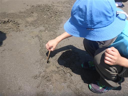 息子は再びカニ捕り。棒で突っつくが捕まえることができず不機嫌だ。