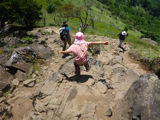 草原の中の道に所々岩場が現れる。岩場を慎重に降りる。