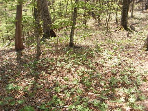 地面にはヤブレガサの大きな葉がいっぱい敷き詰められている。