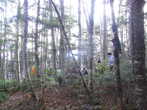 コンパスで方向を定めて歩いていくと、登山道を表す赤テープが表れる。