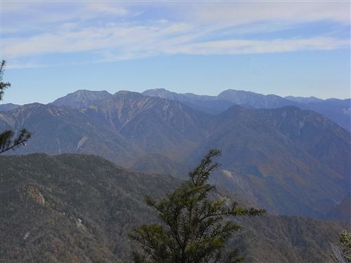 山頂手前でもう一度大きく展望が開ける。南ア深南部の山々が広がっている。