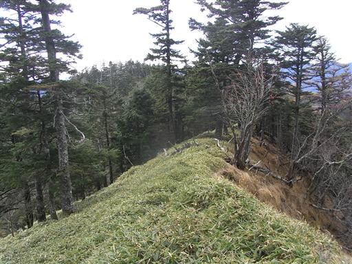 笹に覆われた尾根は、二重山稜になっているところもあり分かりにくい。