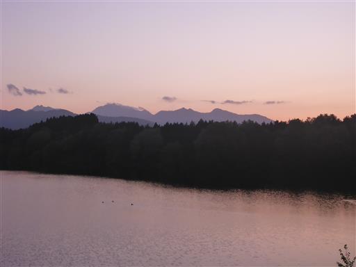 大山池の堤からの景色。真ん中左の少し雲がかかっている山が伯耆大山だ。
