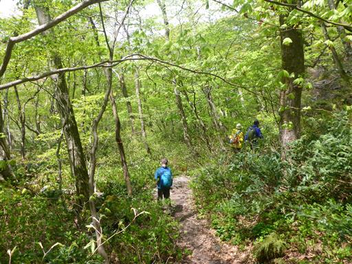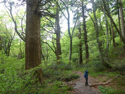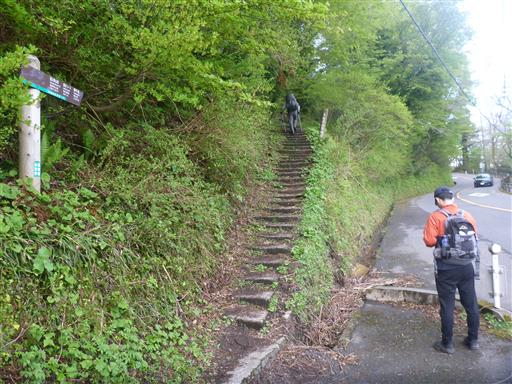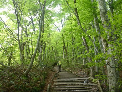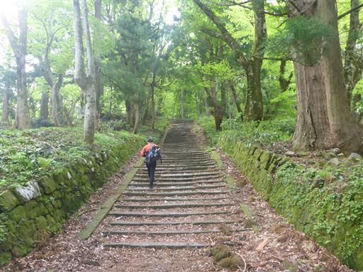 新緑の森の中を登って行く。ずっと階段が続き、結構歩きづらい登山道だ。