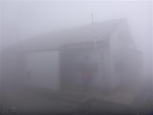 六合目避難小屋に到着。ついに雲の中に突入してしまった。