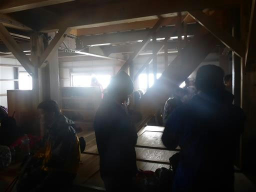 六合目避難小屋に戻ってくる。小屋の中は比較的きれいだが、かなり狭い。