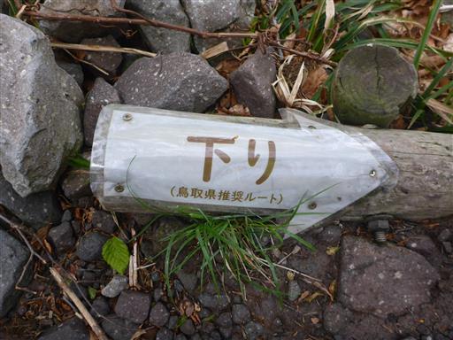 避難小屋からすぐ先の分岐点。登りと道を変えて、鳥取県推奨ルートを下る。
