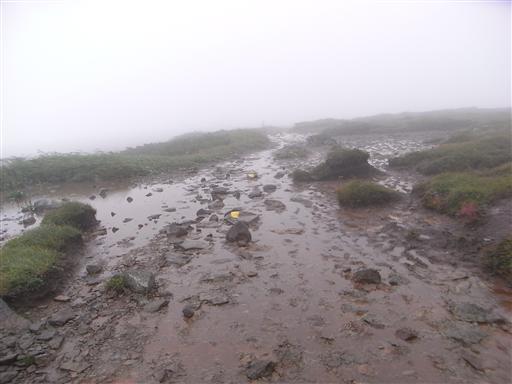 雨はだんだんと激しくなり、登山道は水溜りだらけだ。