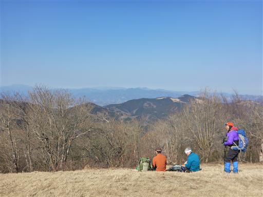 山頂でおやつ休憩を取る。目の前に見えるのは大霧山から北に続く山稜だ。