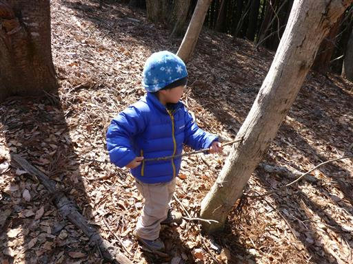 途中で木の枝を拾って遊んでいる。歩くのが遅いので娘は先に行ってしまった。