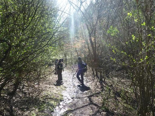 光が差す明るい登山道を下っていく。