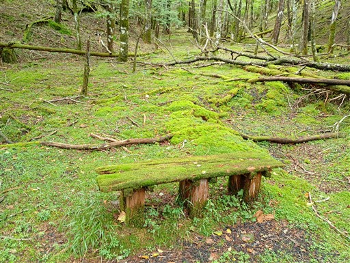 コケに覆われたベンチ。10年以上人が座ってなさそうだ。