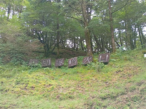 噴火口の底から見上げると、大きな標識が見える。