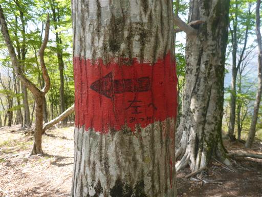本山行で一番難しい分岐点で、大きな木には矢印が書かれている。