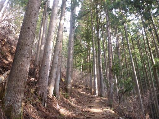 スギ林の中を登って行く。花粉が心配だ。