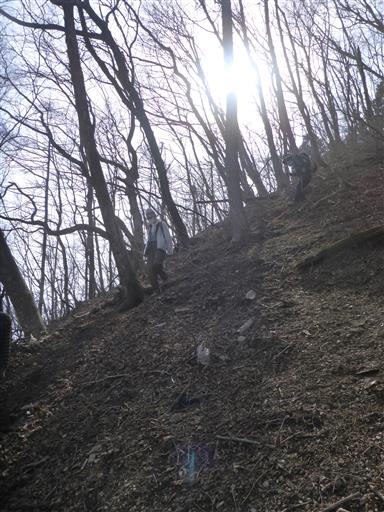 下り始めはものすごい急斜面だ。北側斜面で雪解け直後なのか、