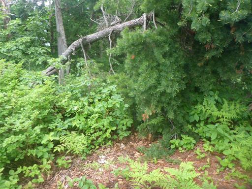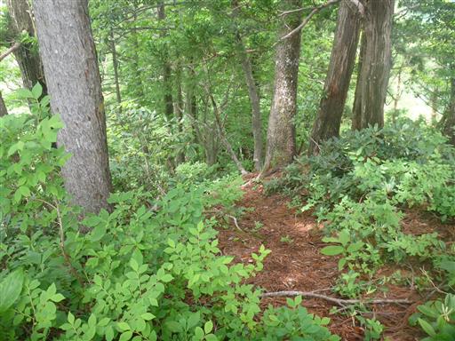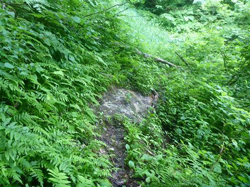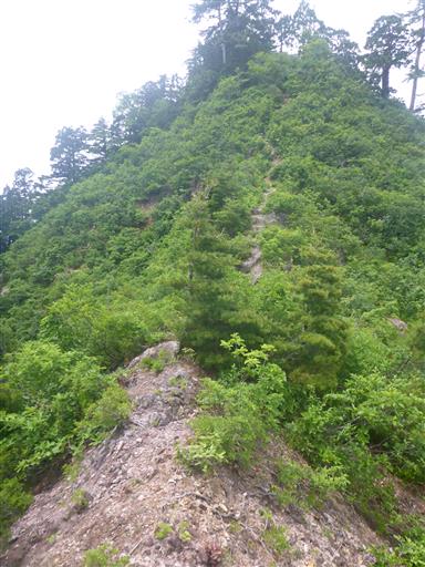 傾斜がきついところは藪の中に逃げる。ところどころロープがある。