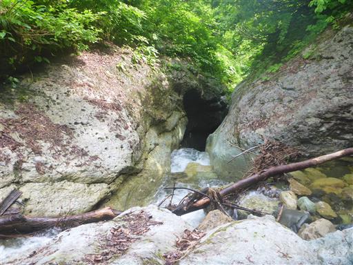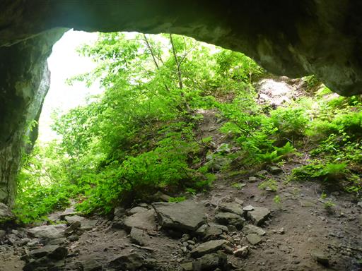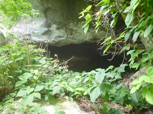 藪をかき分けると岩の麓にぽっかりと口を開けた穴が見つかる。