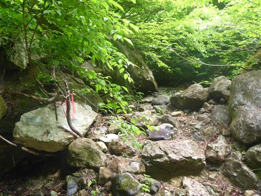 右手のシジミ沢。ピンクリボンがある。ここから登って行く。