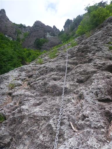 右手を見ると、灌木の向こう側のスラブ壁に鎖が見える。