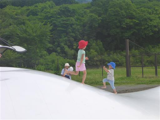 公園内は広い。子供たちは川に辿り着く前にトランポリンに引っかかっている。