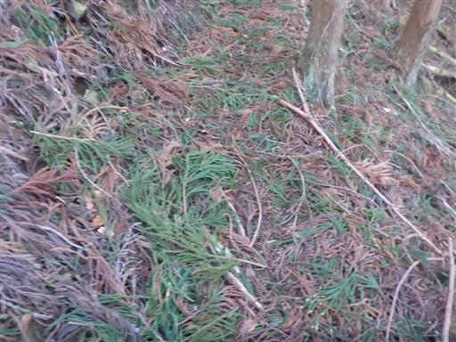 緑の杉の葉が大量に落ちている。昨日の暴風雨の影響だろうか?