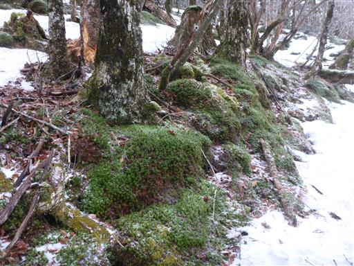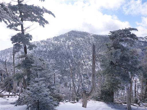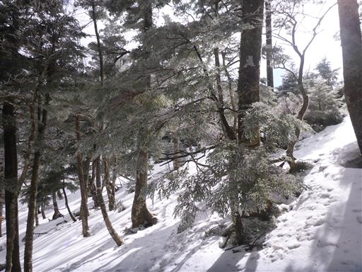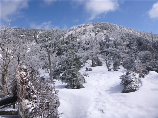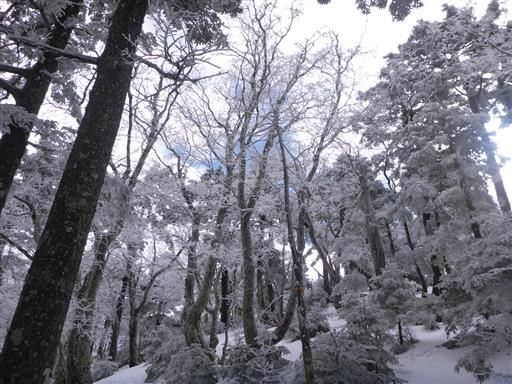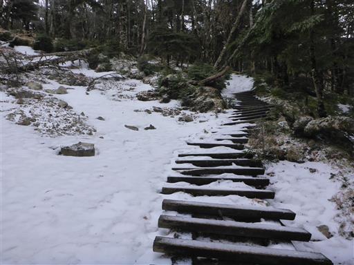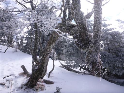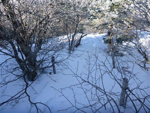 山頂を出発し、弥山に向かう。雪で地面が高くなっているため、両側の枝が鬱陶しい。