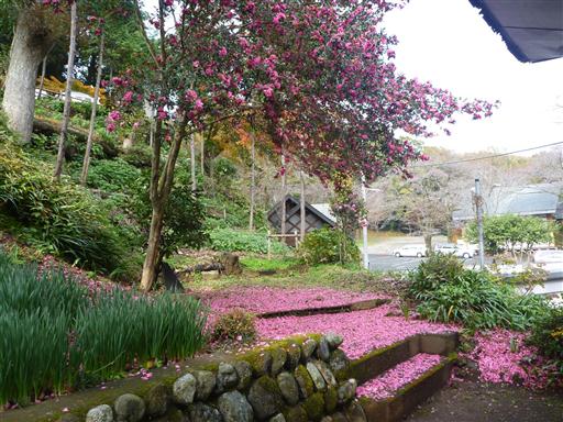椿の花びらが地面に積もっている。一面ピンク色でなかなか美しい。
