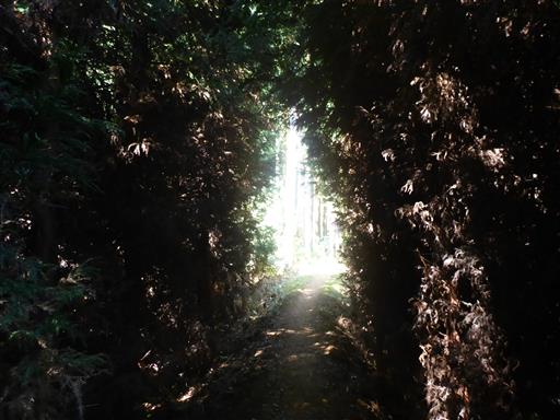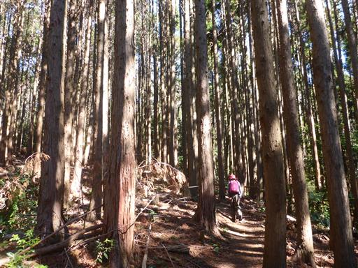 途中の杉の植林地帯で夜のように真っ暗になる。