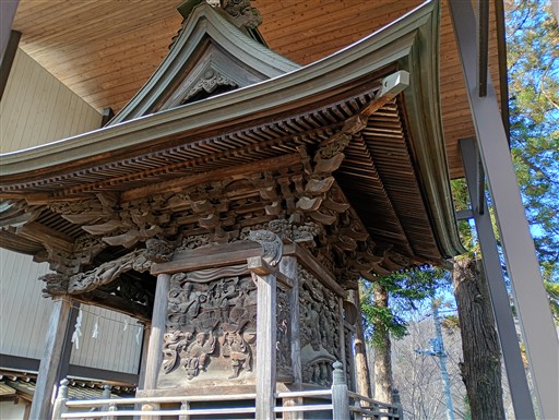 細かい彫刻が施されている、あまり見ない形の神社だ。