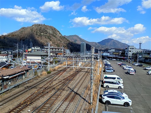 歩道橋を渡る。見えているのは左から岩殿山、百蔵山、扇山だ。