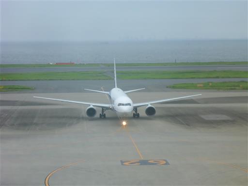 真正面に着陸した飛行機がやって来る。ボーディングブリッジが飛行機と接続したり、