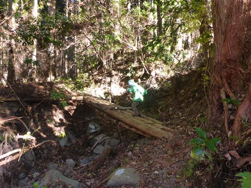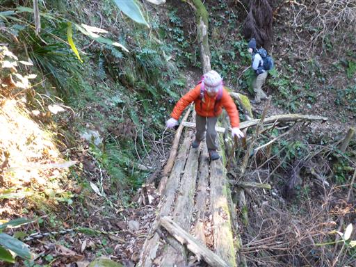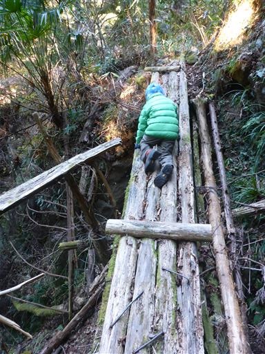 慎重に木の橋を渡る。木が腐っていてかなり揺れる橋だ。