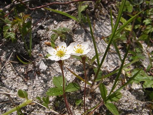 樹林帯との境界附近にはシロバナノヘビイチゴが花を咲かせている。