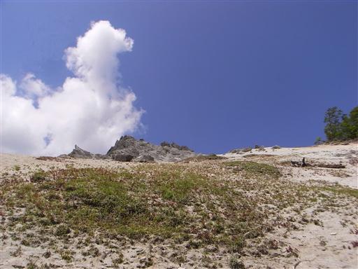 眩しい山頂部を振り返る。白い砂と青い空がきれいだ。