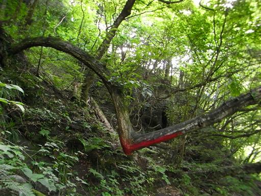 登山道を塞ぐように不思議な形に折れ曲がった枝が伸びている。