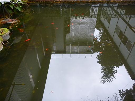 寒そうな池には金魚(?)がたくさん泳いでいる。