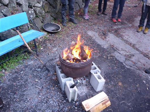 臨時便のバスに乗りケーブル下バス停に到着。側にたき火があって息子は興味津々だ。