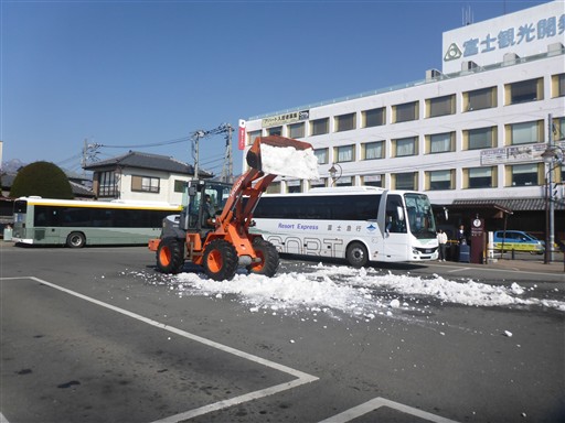 ホイールローダーが駐車場に雪をばらまいている。