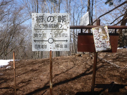 | ルート (Map) | 精進バス停 (9:55) - (10:36) 女坂峠 - (11:06) 三方分山 - (11:40) ヌケド峠 - (11:56) 新八坂峠 - (12:44) 地蔵峠 - (12:59) 大平山 - (13:54) 蛾ヶ岳 - (14:39) 大畠山 - (14:55) 四尾連湖 - (15:08) 四尾連峠 - (16:08) 大門碑林公園 - (16:21) 市川本町駅 |