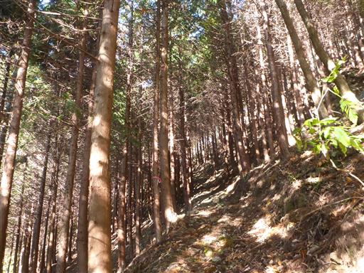 ようやく杉林の中に登山道を発見し、正規ルートに復帰。
