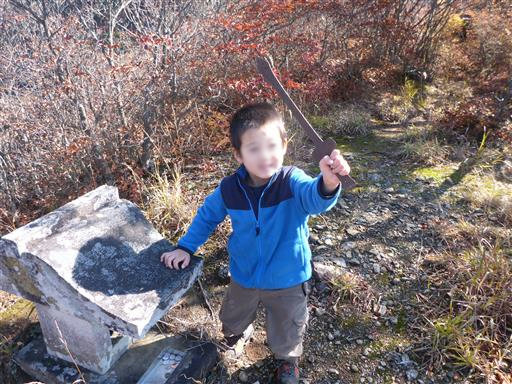 息子は祠に奉納されている剣を見つけて喜んでいる。