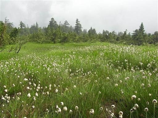 本来ならふわっとしているワタスゲも、雨に濡れてしっとりしている。