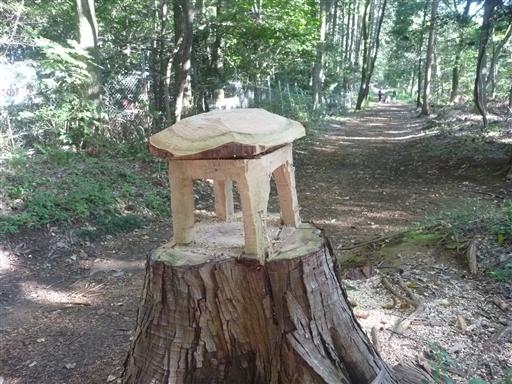 家のような形に切られた木。切り株の上に載せられているのではなく、くっついている。