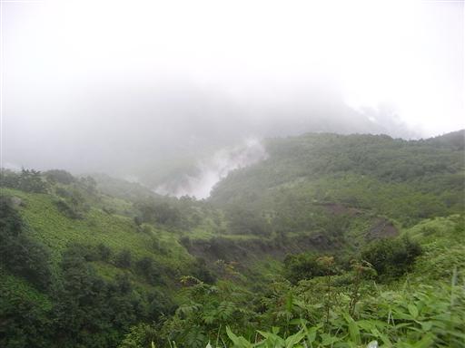 溶岩ドームが聳える脇を歩いていく。硫黄の臭いが漂っている。