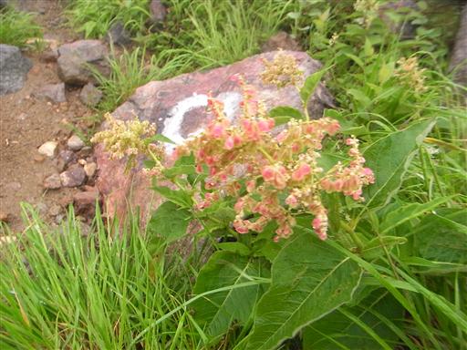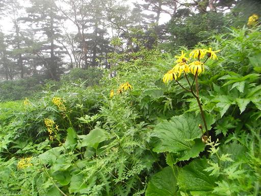 周囲はオタカラコウやマルバダケブキなどの大きな花が咲いている。