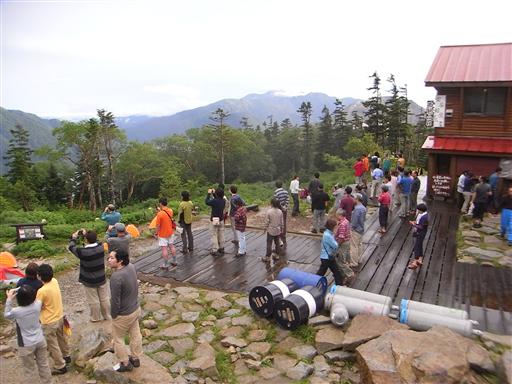 展望が広がっていると知って多くの人が小屋から外に出てくる。