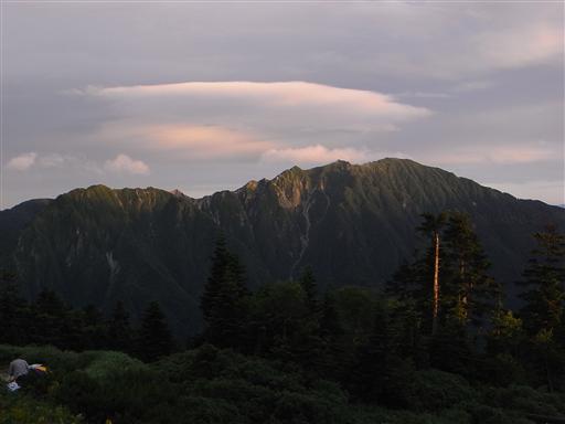 小屋で夕食をとった後、外に出てみると、なんと雲が晴れて焼岳が見えている。