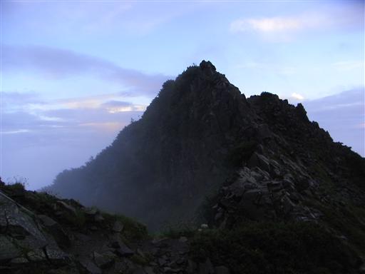 ヘッドライト無しで歩ける程度に明るくなるのを待って、西穂高岳に向かう。